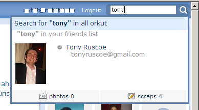 Orkut has a nice new feature, something like google suggestStart typing your keyword in the searchbox on the top left corner, it will give you a suggestion from your friend list.Screenshothttp://www.rohit11.com/share/outer-court/orkut_search.png